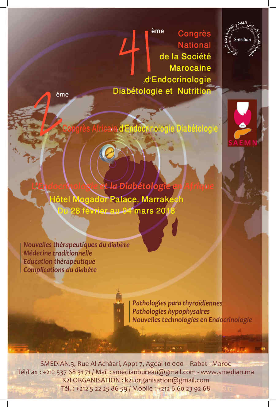 Casablanca, le 17 janvier 2018 – La Société Africaine d'Endocrinologie Métabolisme Nutrition (SAEMN), en collaboration avec la Société marocaine d’endocrinologie, diabétologie et Nutrition (SMEDIAN), organise le 2ème Congrès de la Société Africaine d'Endocrinologie Métabolisme et Nutrition du 28 février au 3 mars 2018 au Palais de Congrès, Mogador Palace Agdal de Marrakech. Placé sous le thème « l’endocrinologie et la diabétologie en Afrique », cet événement scientifique regroupera près de 600 professionnels de santé venus du Maroc, du Maghreb, d’Afrique subsaharienne, d’Europe (Suisse, Belgique, France…) et d’Amérique du Nord (Canada). La SMEDIAN saisit également cette occasion pour tenir son 41e congrès national.