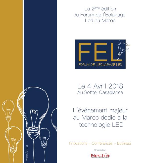 Le 04 Avril 2018, à l’hôtel Sofitel de Casablanca, se tiendra pour une deuxième fois consécutive au Maroc, le Forum de l’Eclairage Led. Dédié aux professionnels de l’éclairage, le FEL est un événement regroupant une zone d’exposants, une série de conférences, du réseautage et plus encore !