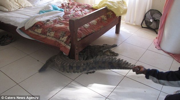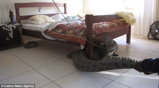Mr Whitall, dans sa résidence du Zimbabwe, sortait d'une nuit banale et prenait son petit déjeuner lorsqu'il a entendu les cris stridents de sa femme de chambre : un crocodile s'était "caché" sous son lit. Pendant plus de 8 heures, alors qu'il dormait paisiblement, ce crocodile de 130 kilos et mesurant près de 2,50 m n'avait pas bronché jusqu'à l'arrivée de l'une de ses employés de maison. Rien de très rassurant lorsqu'il réalise quelques minutes après qu'en se levant, il avait posé ses pieds nus juste à côté de l'animal à la mâchoire destructrice...