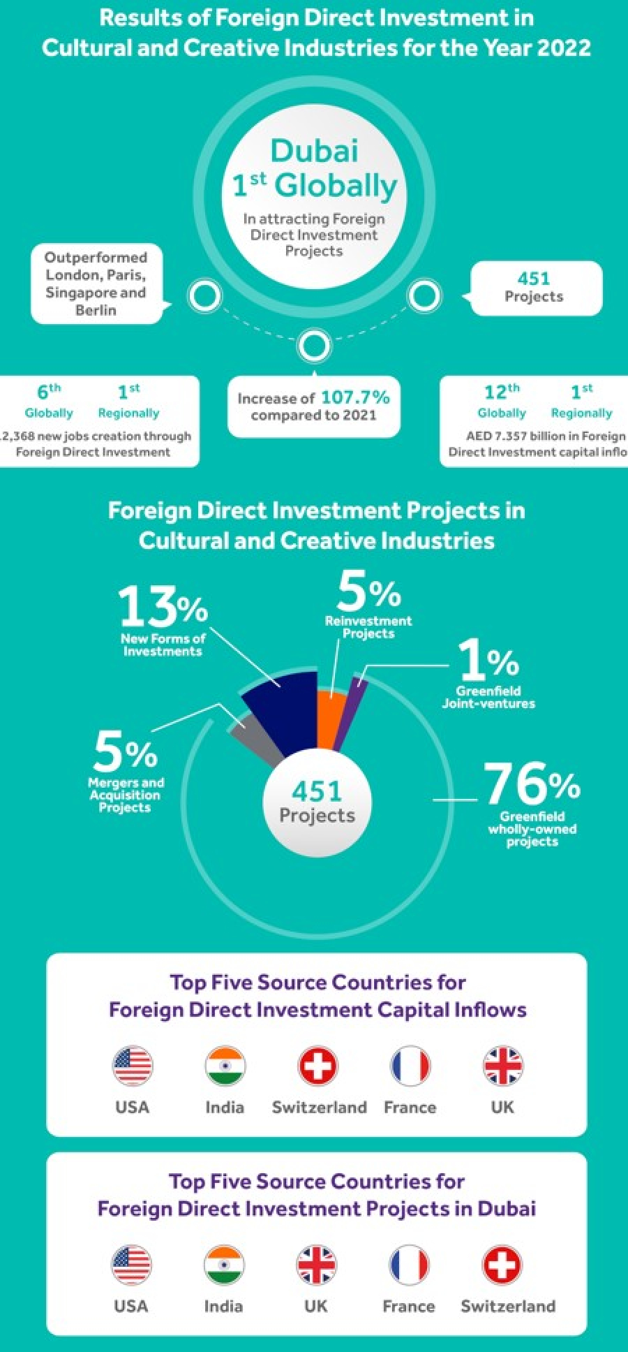 Le rapport émis par Dubai FDI Monitor, et qui puise ses données du service « fDi Markets » du Financial Times, confirme le statut de premier plan de Dubaï. Le rapport révèle que Dubaï a attiré le plus grand nombre de projets d'IDE dans les secteurs culturels et créatifs, conservant sa 6e place mondiale en matière de création d'emplois grâce aux IDE. Les nouveaux projets d'IDE, où les entreprises sont détenues à 100 %, constituaient la grande majorité et représentent 76 % du total des projets d'IDE dans les secteurs culturels et créatifs de Dubaï.