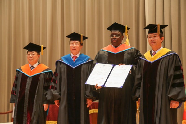 Après une présentation succincte de la carrière du Président Macky Sall, le Président de l’université a remis le diplôme et les insignes de Docteur Honoris Causa au Président Sall pour récompenser ses contributions à la réalisation de la démocratie, au développement du Sénégal et aux échanges industriels et économiques entre la Corée du Sud et le Sénégal.