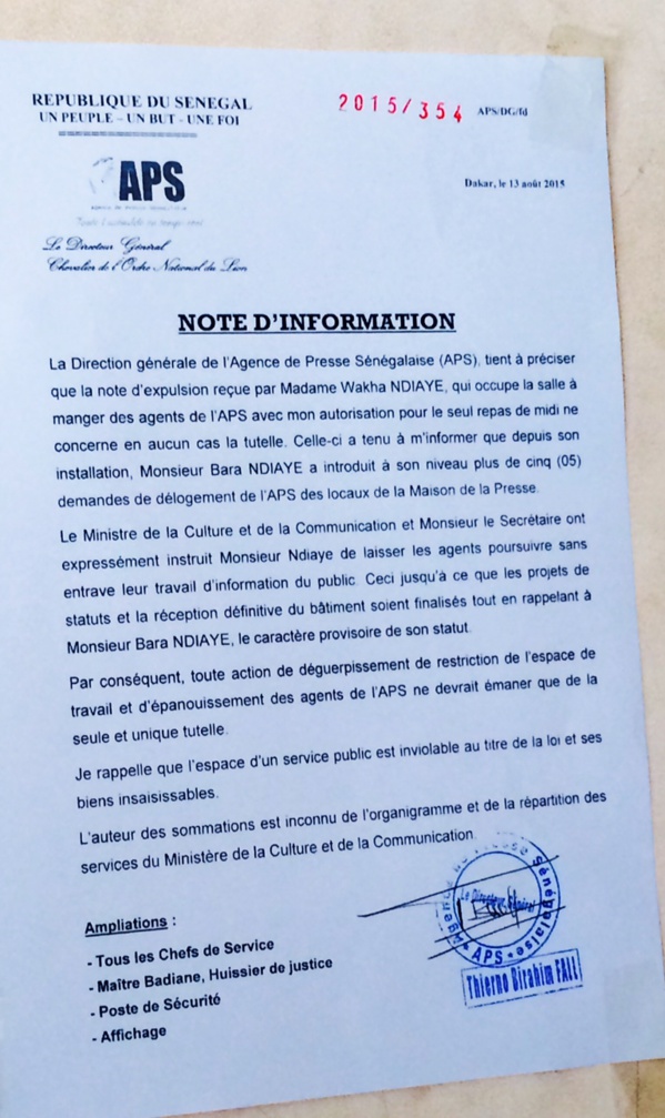 La question garde tout son pesant d’or, et pour cause. Alors que Bara Ndiaye, propulsé à la tête de la Maison de la presse par le Président de la République, Macky Sall, a lancé un appel d’offres pour trouver un repreneur du Restaurant et a pris une mesure expulsant l’actuelle gérante de celui-ci, en l’occurrence Madame Wakha Ndiaye, Thierno Birahim Fall s’est fendu d’une note, dont Actusen.com a pu obtenir copie, et dans laquelle il oppose une résistance-tout-terrain. Aux fins de maintenir la restauratrice sur les lieux.
