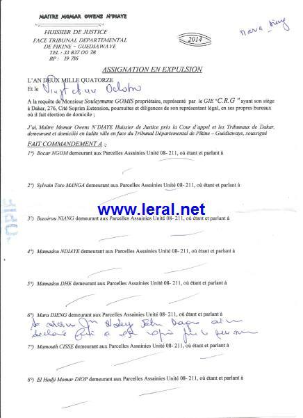 A moins que le juge des référés, près le tribunal départemental de Dakar, devant qui elles sont citées à comparaître ce vendredi, tranche en leur faveur, quinze familles seront expulsées de la villa 211, sise à l'unité 8 des Parcelles Assainies. Ce, à cause, nous dit-on, de leur bailleur qui a décidé de passer outre la loi portant application de la baisse du coût du loyer.